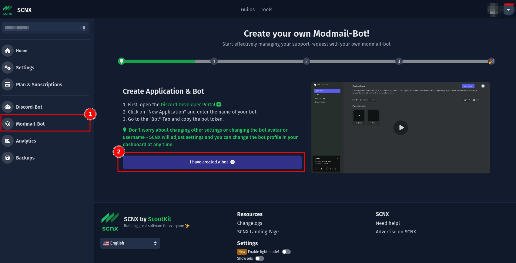 Open the SCNX Dashboard and select the server you want to create the bot for. Next, select "Modmail" in the sidebar. You'll find a video showing how you should create the Discord-Bot. If you've followed this guide, you can confidently skip this using the "I have created a bot"-button.
